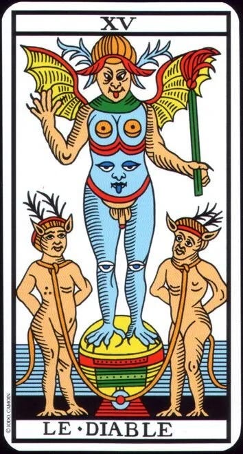 I’ve recently been learning tarot—specifically, the Tarot of Marseilles recovered by the avant-garde filmmaker Alejandro Jodorowsky. His book on tarot is strange and fascinating and a little bit fucked up, if you’re interested. For the beginner, Jodorowsky recommends pulling one card to answer one question. So today, I asked the deck “What is my strength, as a writer?” To my horror, I drew the Devil card. Then quickly consulted Jodorowsky for an explanation.
